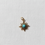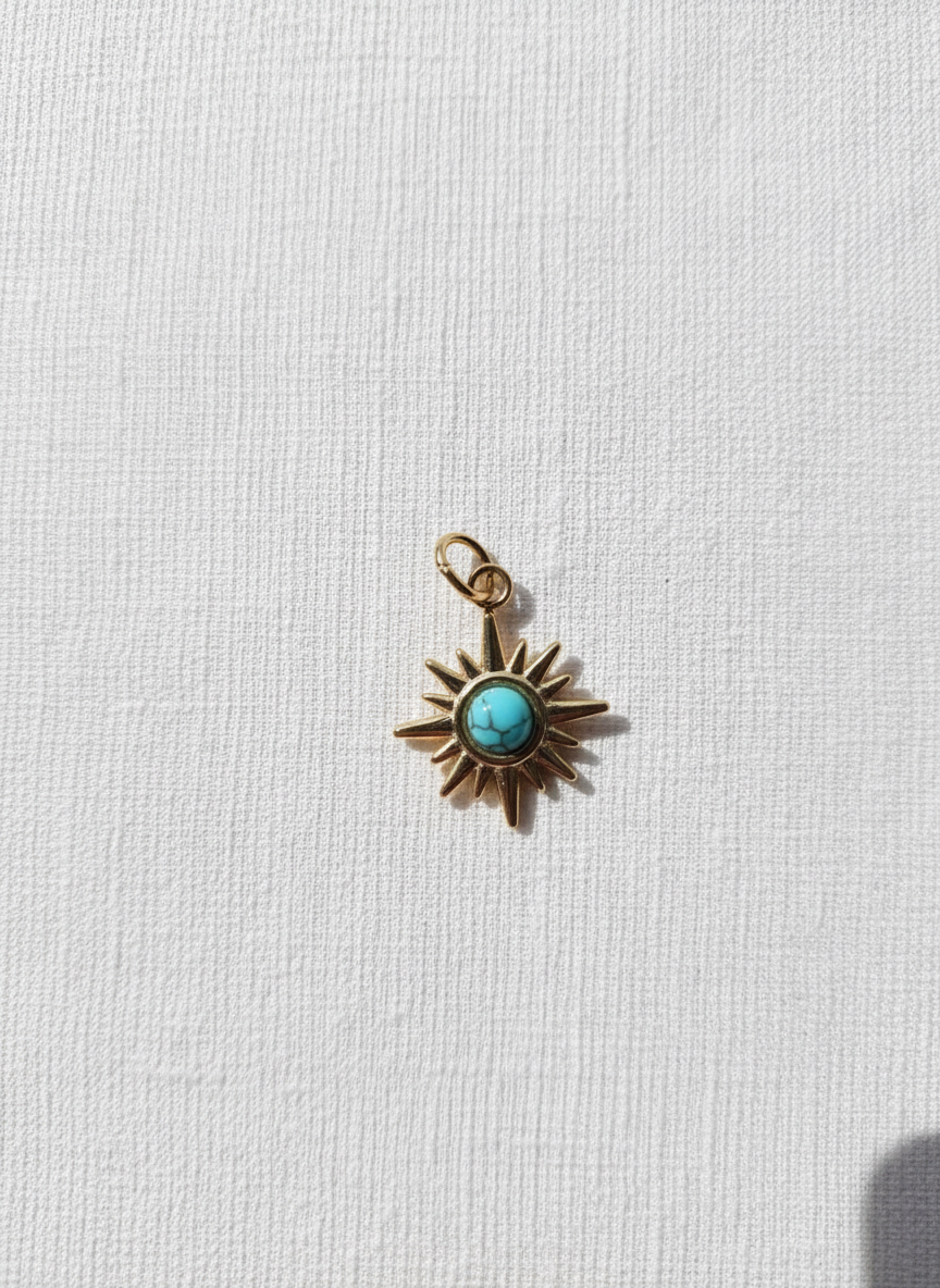 Eleganter Sonnenstrahl-Charm mit türkisblauem Herzen. Wie ein Sommertag an der Riviera eingefangen in Gold – bringt Optimismus und Meeressehnsucht zusammen.