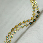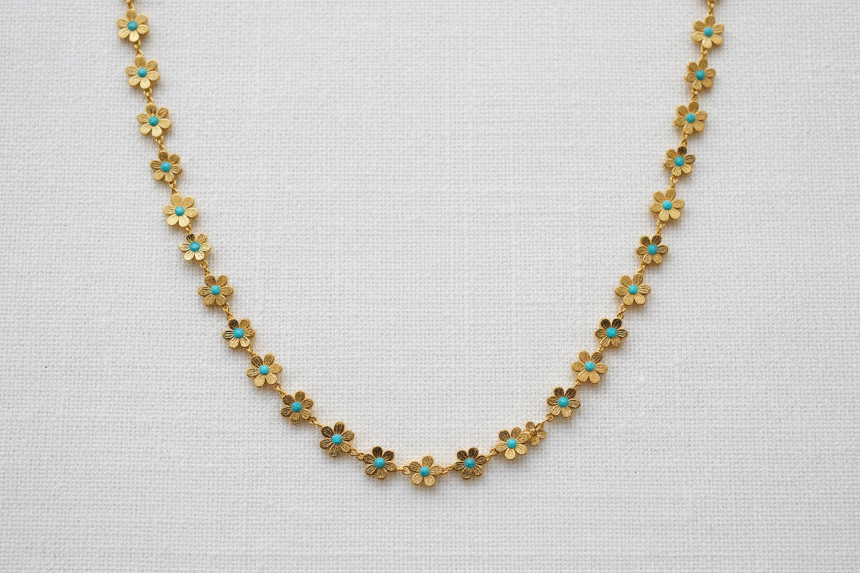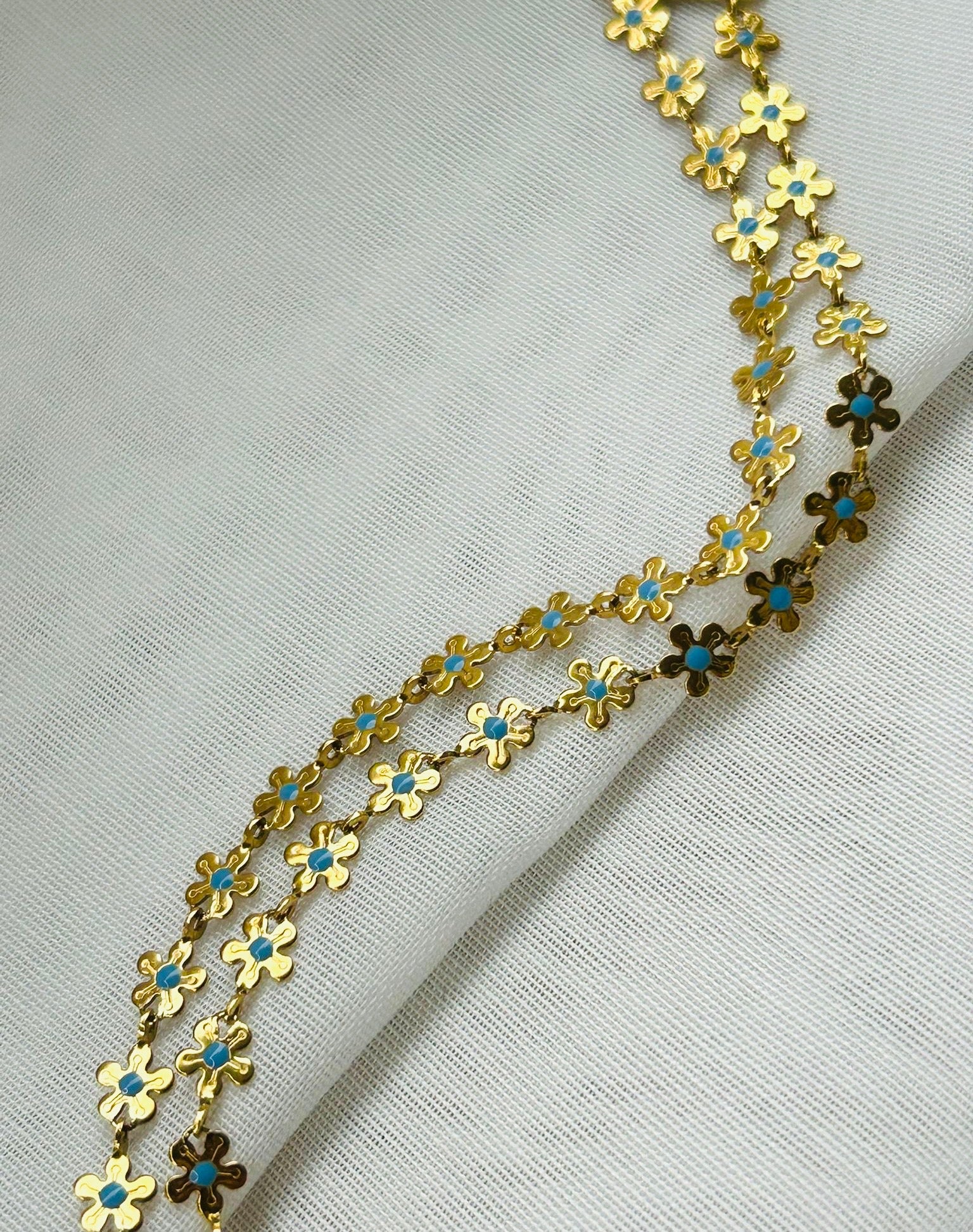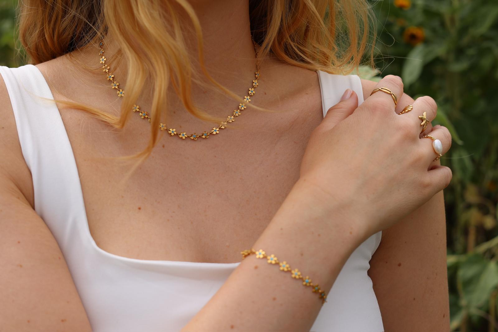Zarte Blumen-Glieder in Gold mit blauen Details. Verspielt-eleganter Vintage-Charme.