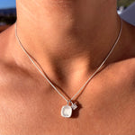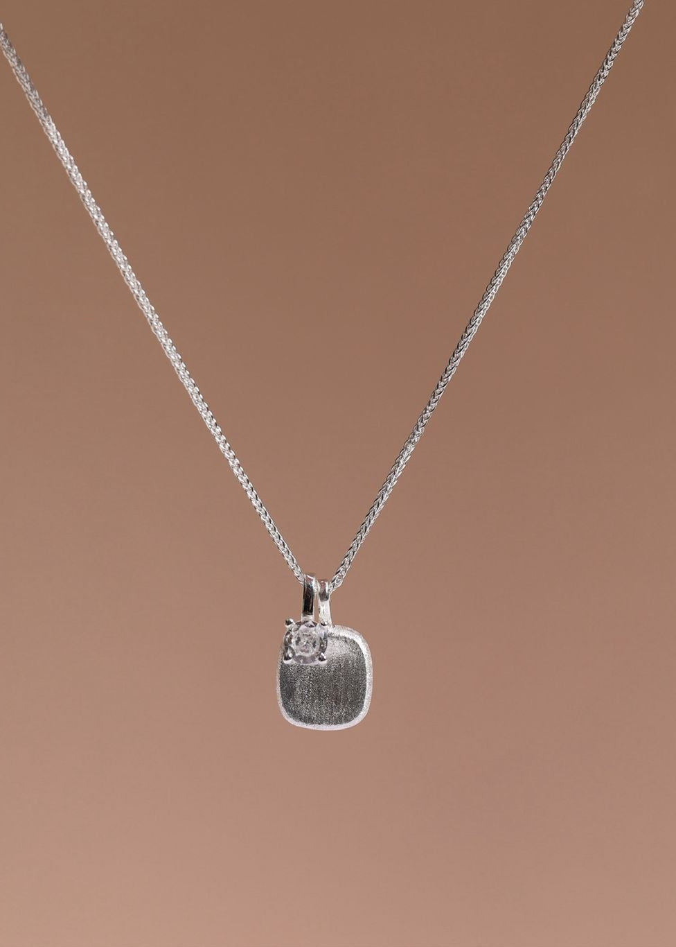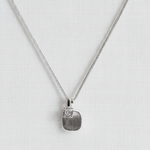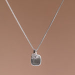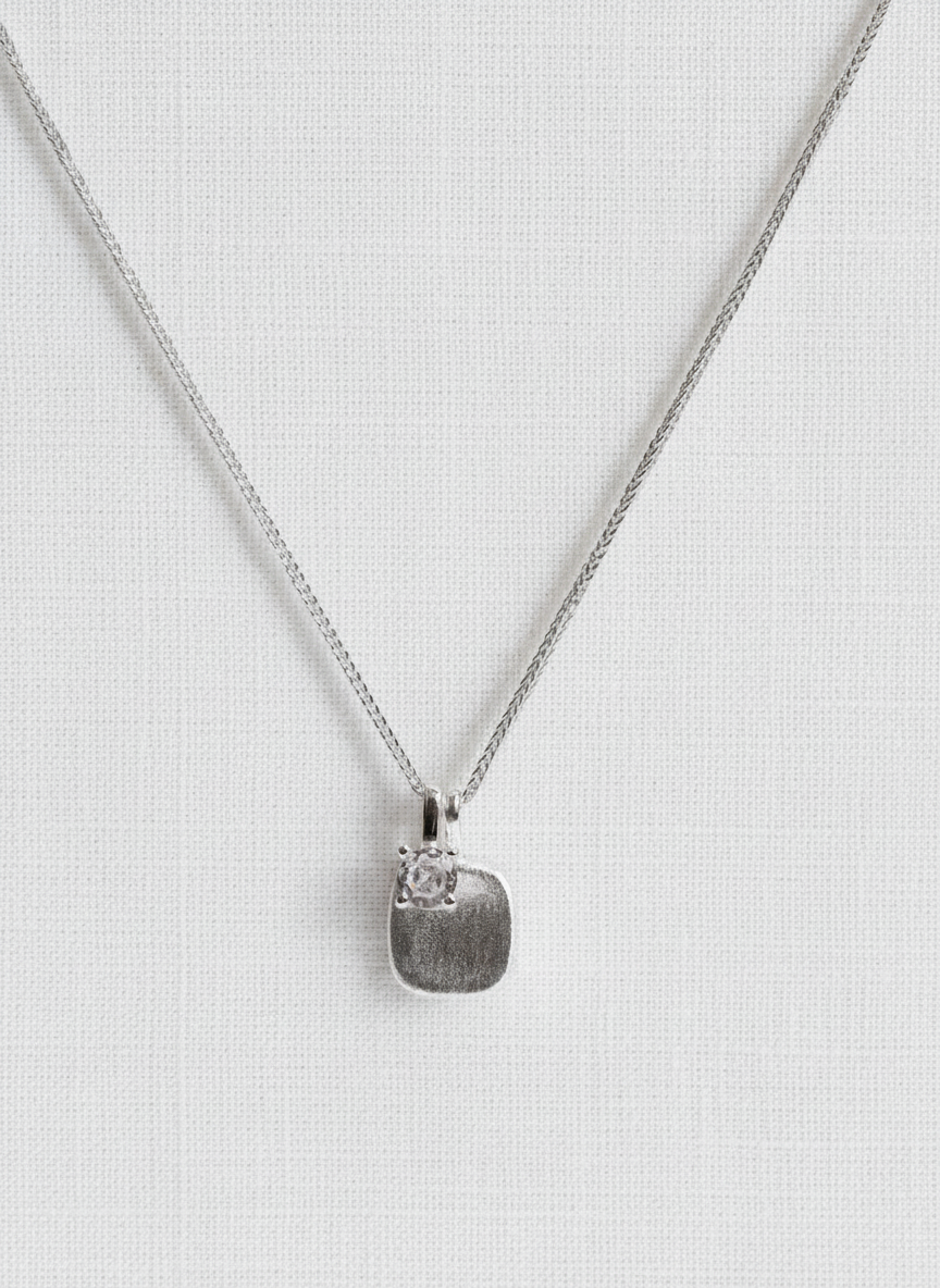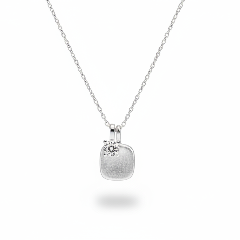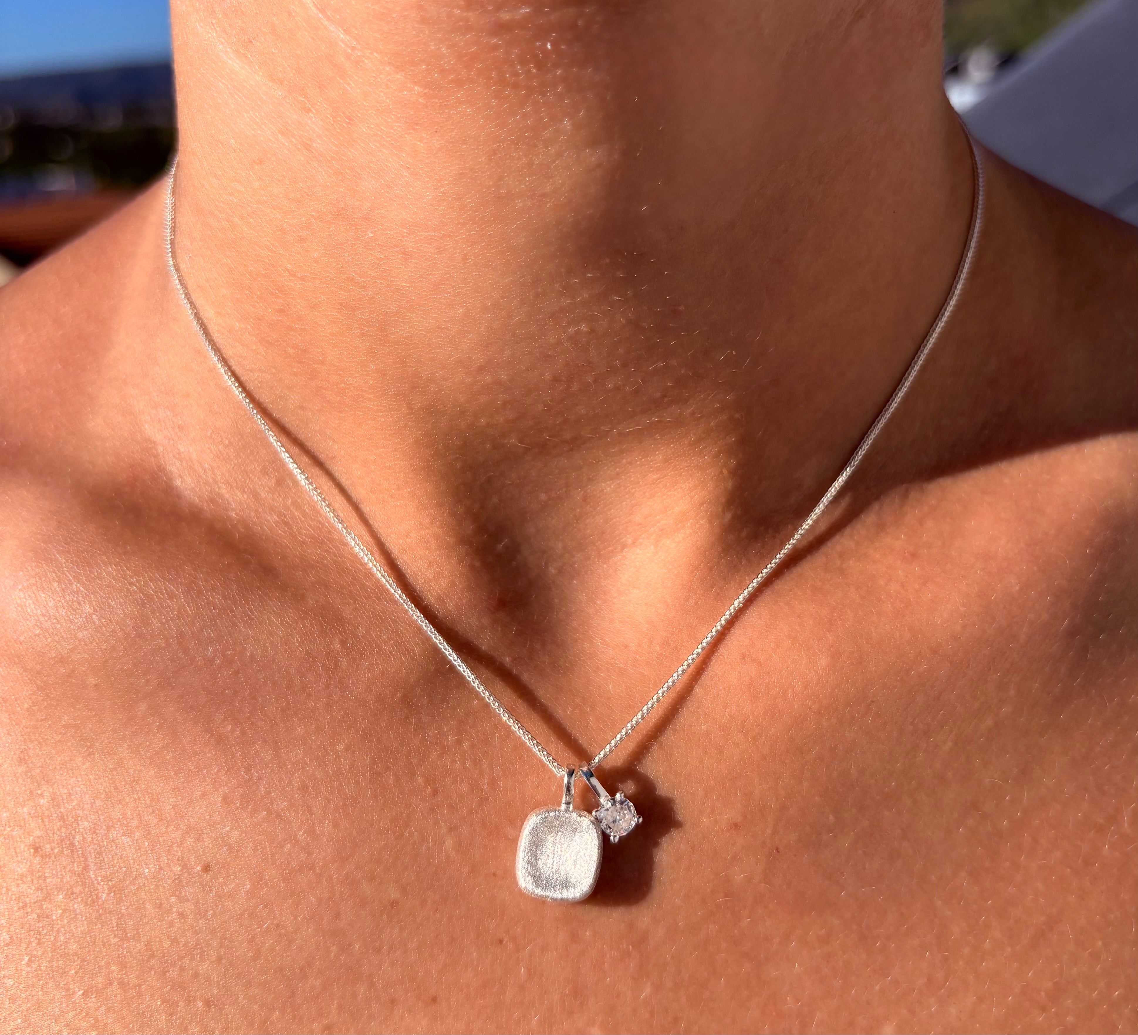 Elegante Halskette mit gebürstetem Silberanhänger und Kristall-Detail. Verkörpert norditalienische Designtradition mit kalifornischer Coolness - vielseitig kombinierbar.