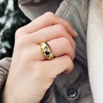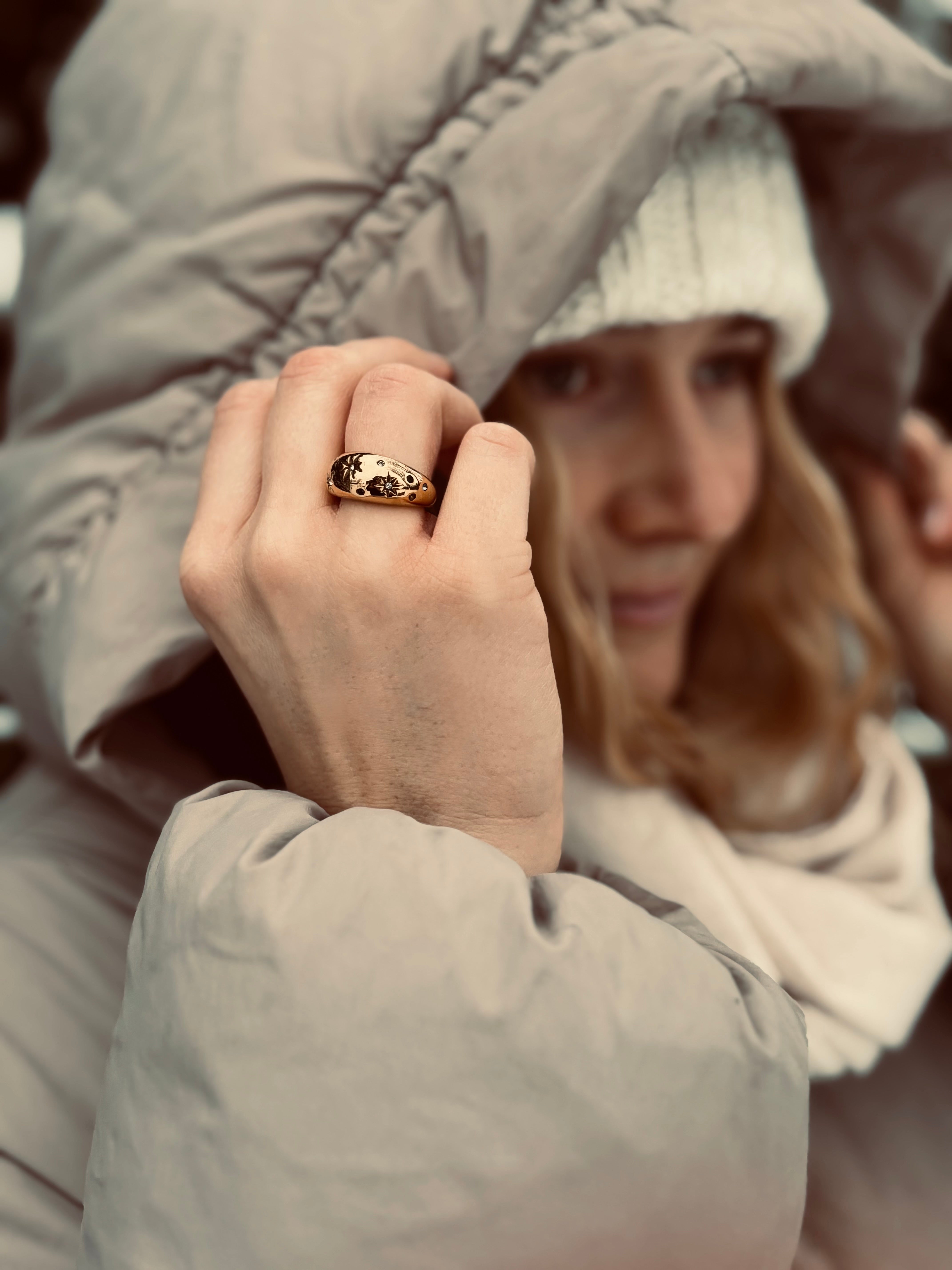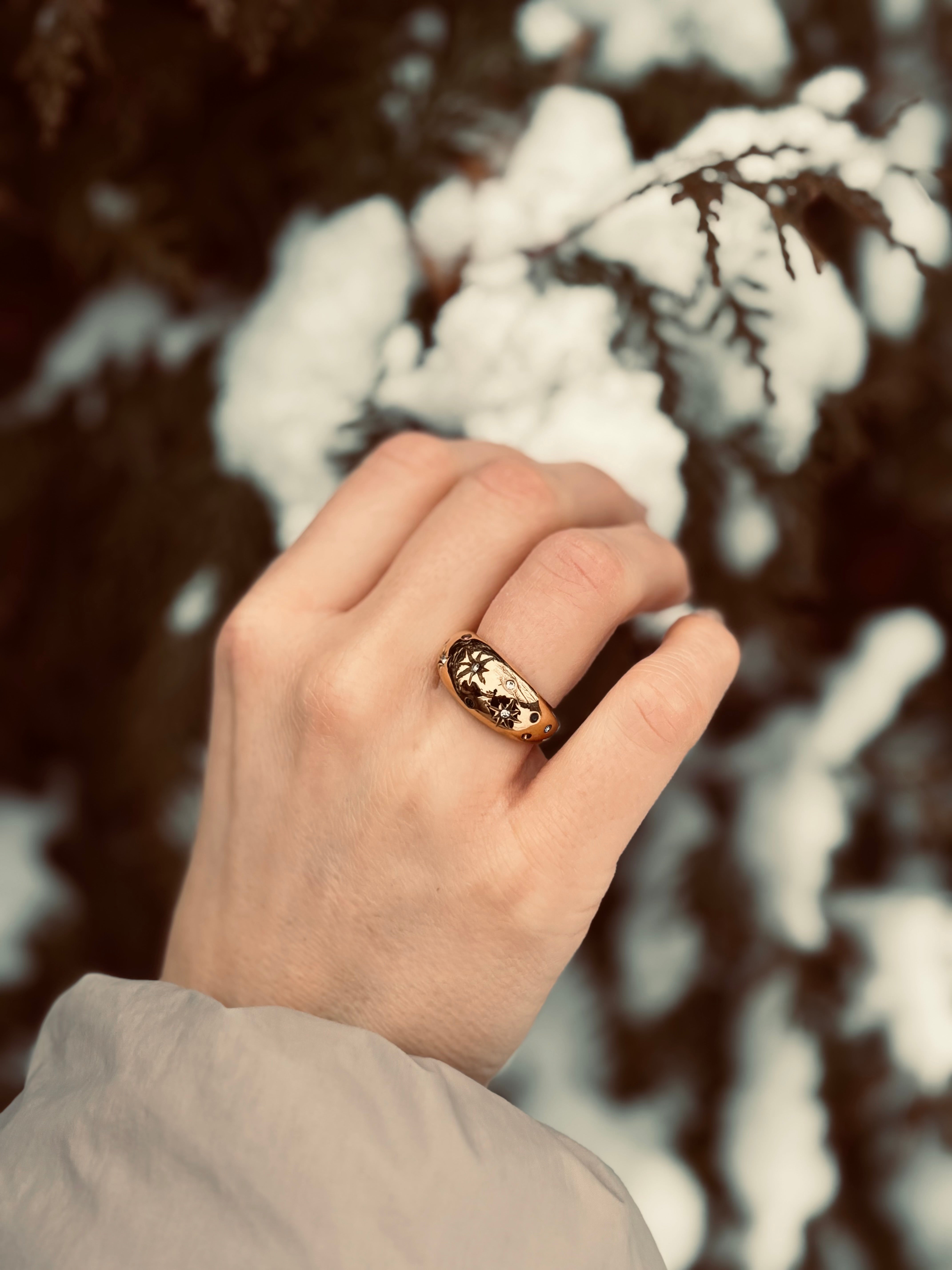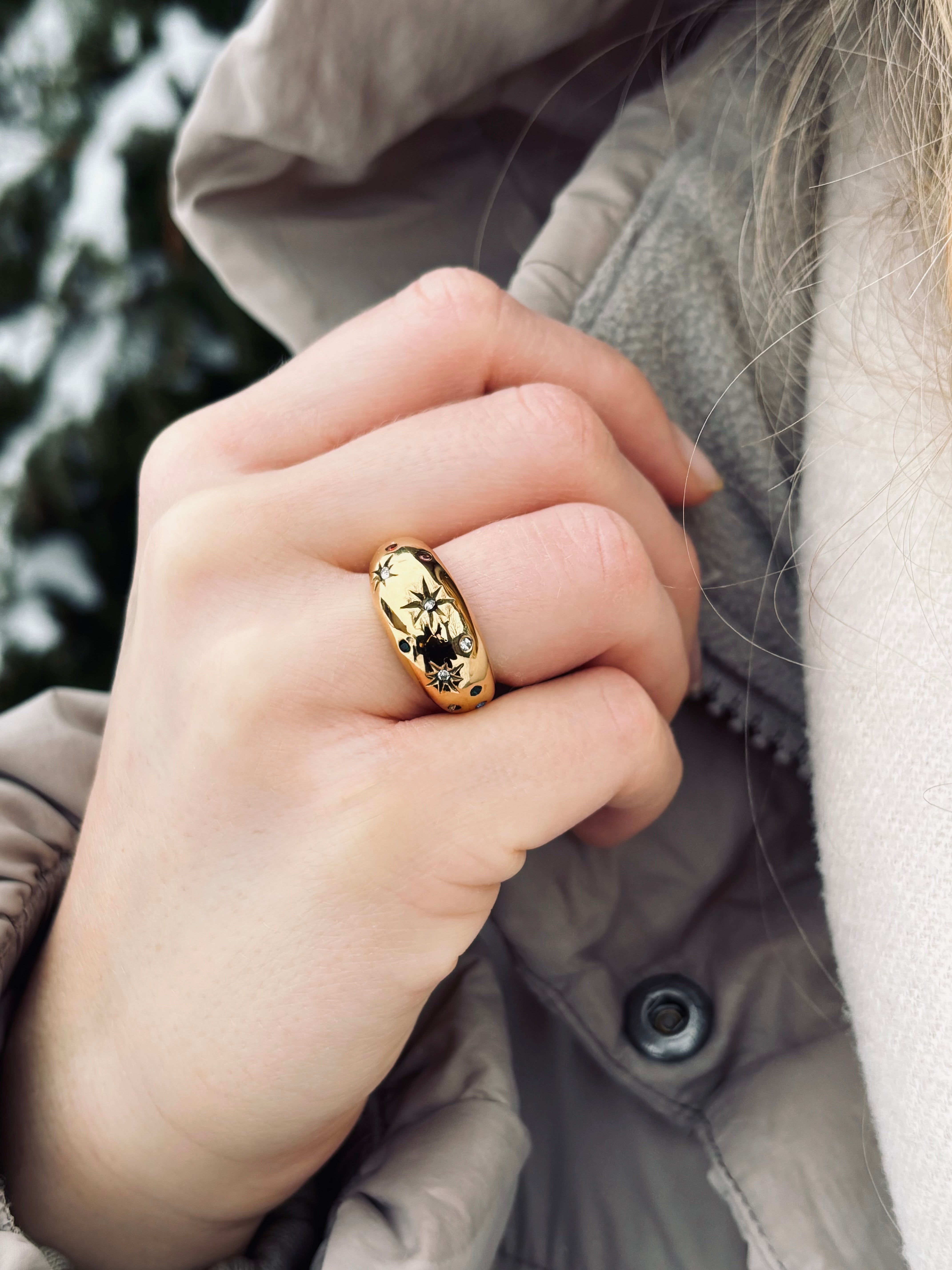 Hol dir die Sterne direkt an deine Hand. Dieser markante Statement-Ring besticht durch seine skulpturale Dome-Form und kunstvoll gravierte Sterne, die mit farbenfrohen Kristallen besetzt sind.