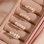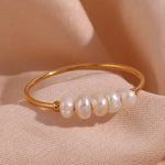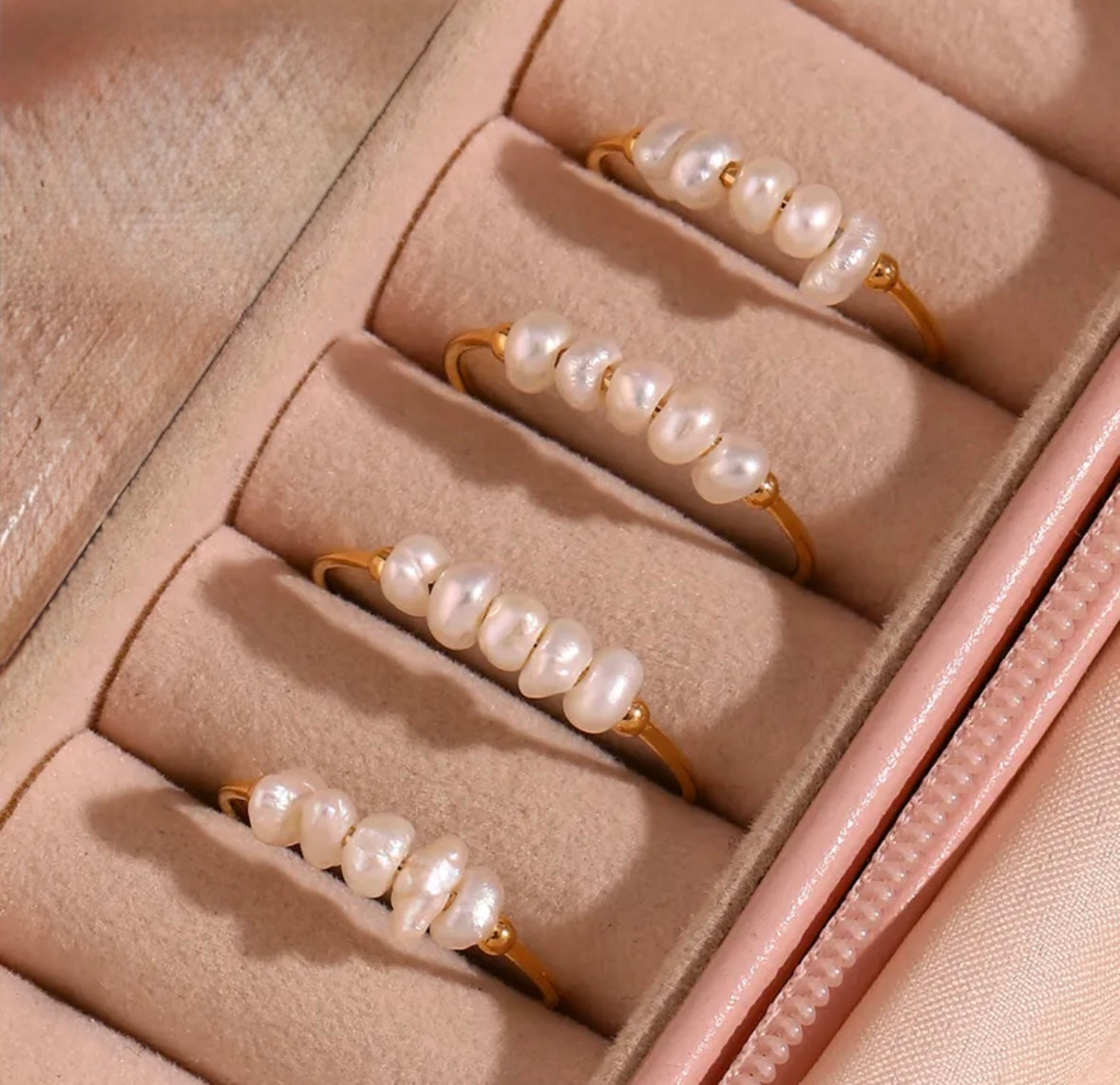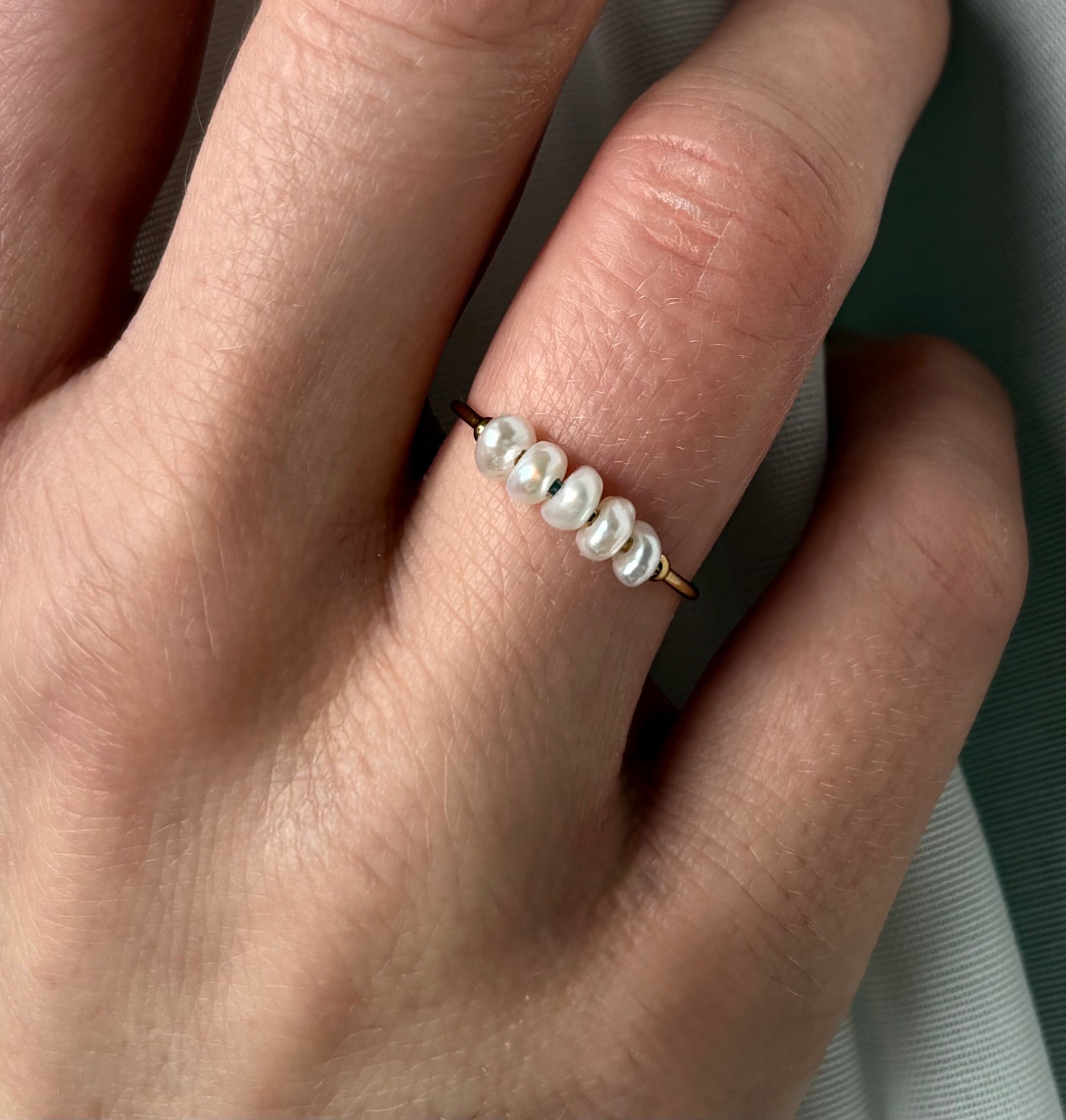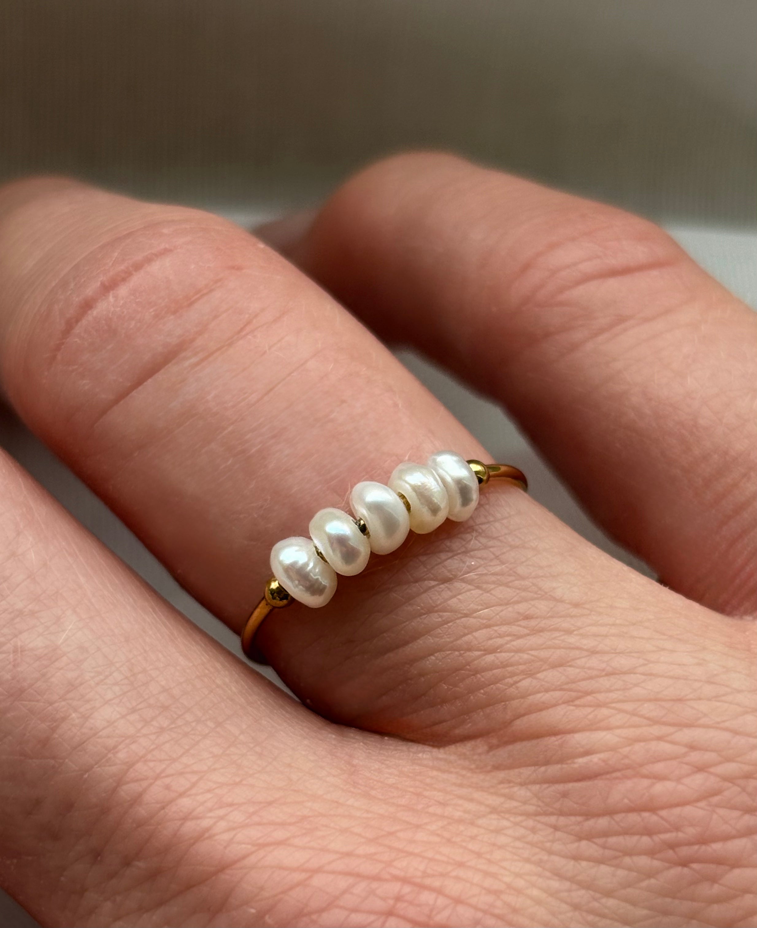 Dieser filigrane Ring fängt die natürliche Schönheit des Mittelmeers ein. Fünf sorgfältig ausgewählte Süßwasserperlen in organischer Form reihen sich auf. Ein minimalistisches Statement, das feminine Eleganz und moderne Leichtigkeit vereint.
