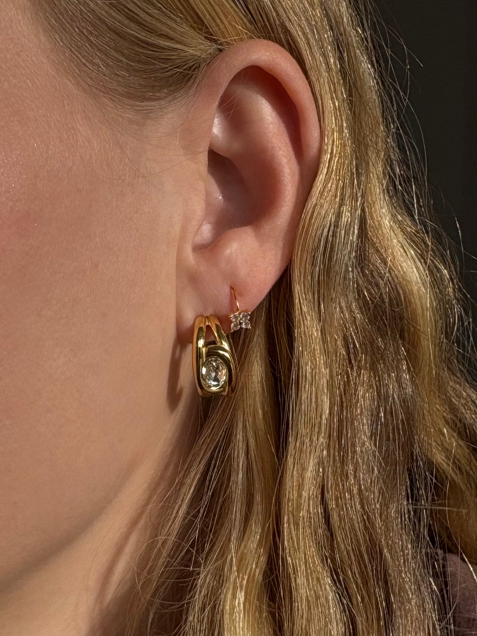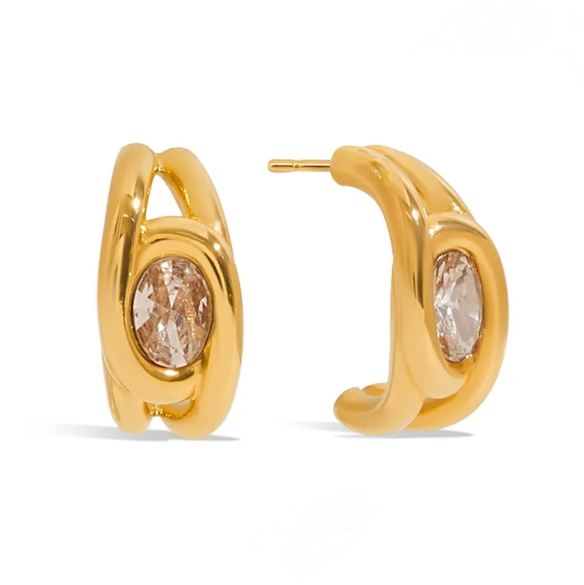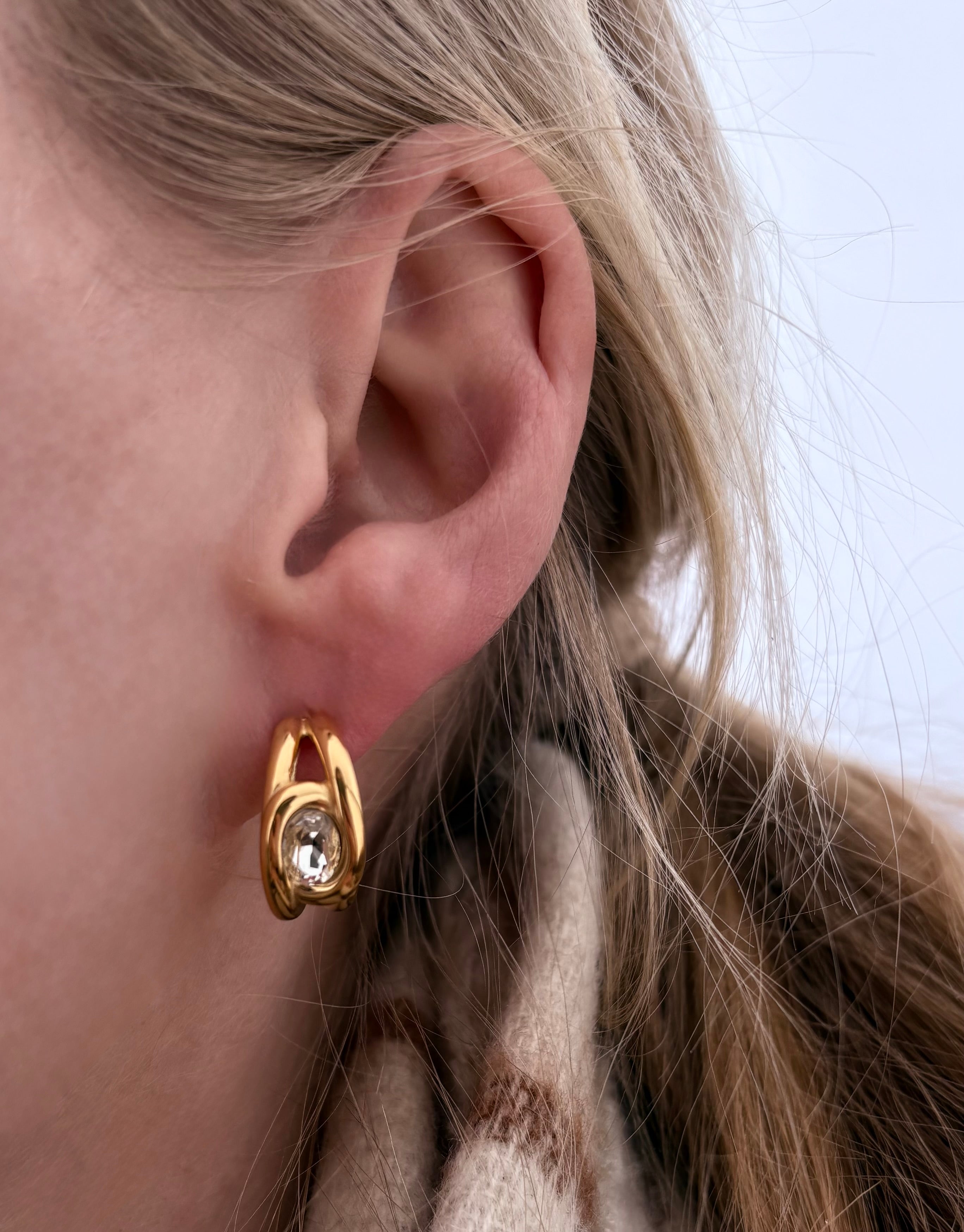 Diese eleganten Hoops zelebrieren das moderne italienische Design durch ihre dynamische, ineinander verschlungene Form. Ein zentraler, oval geschliffener Kristall wird von sanft geschwungenen, goldglänzenden Linien umschlossen und fängt das Licht bei jeder Bewegung ein.