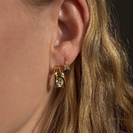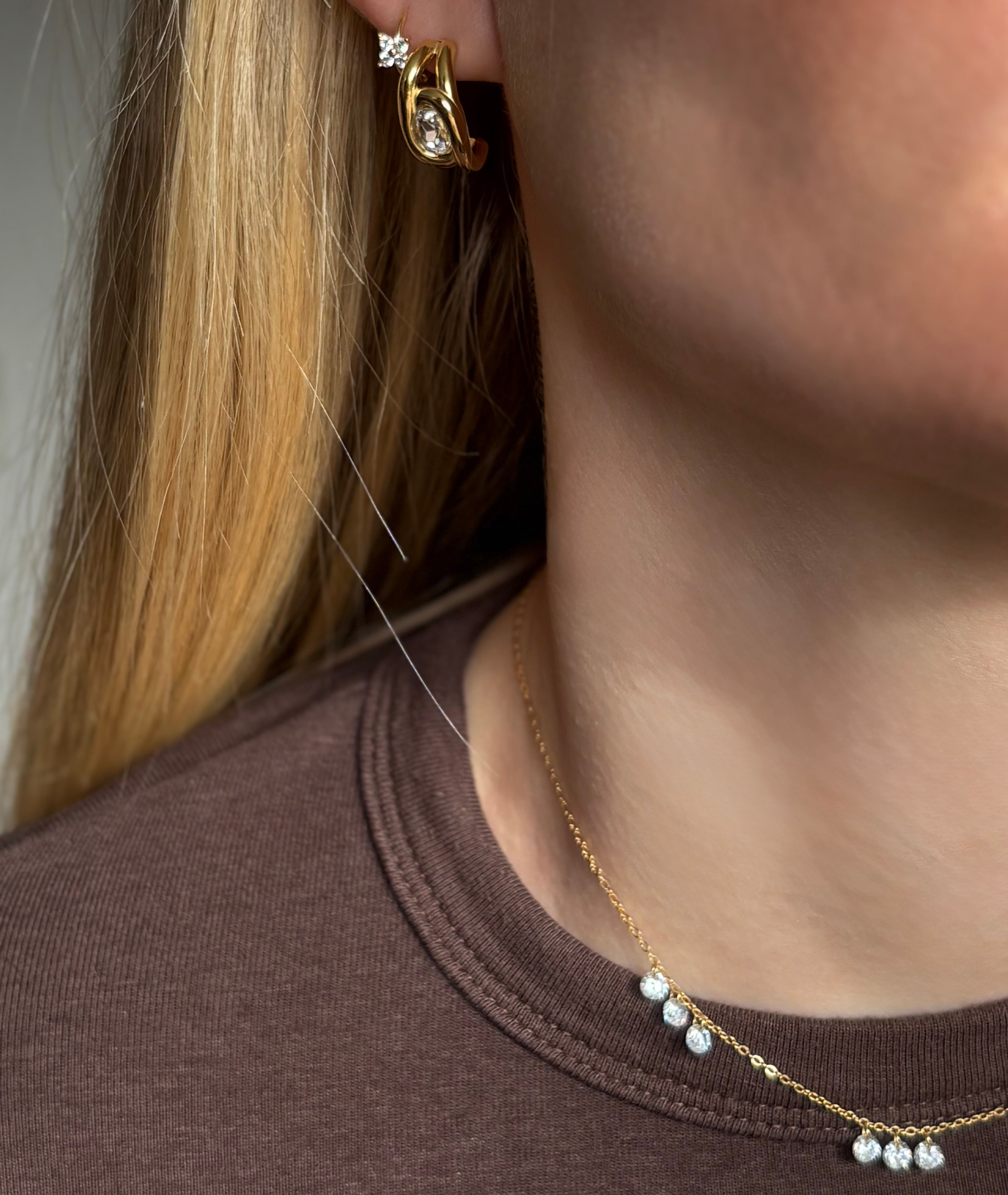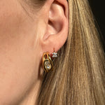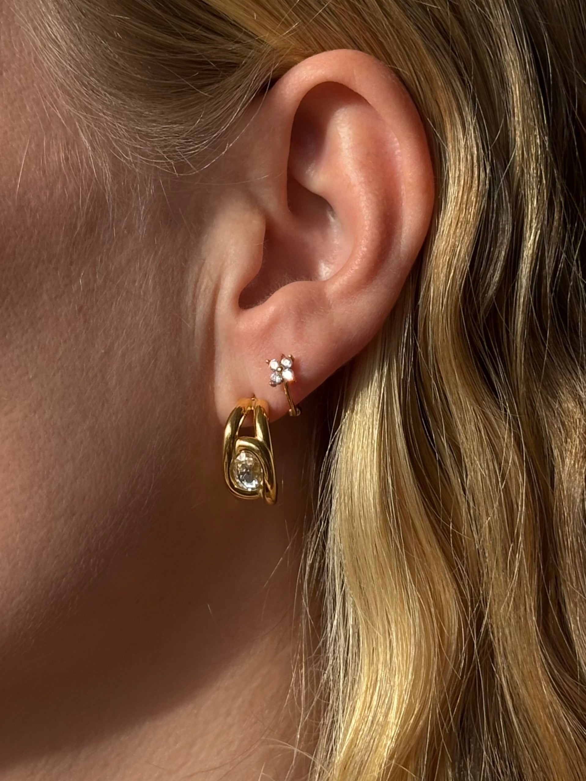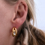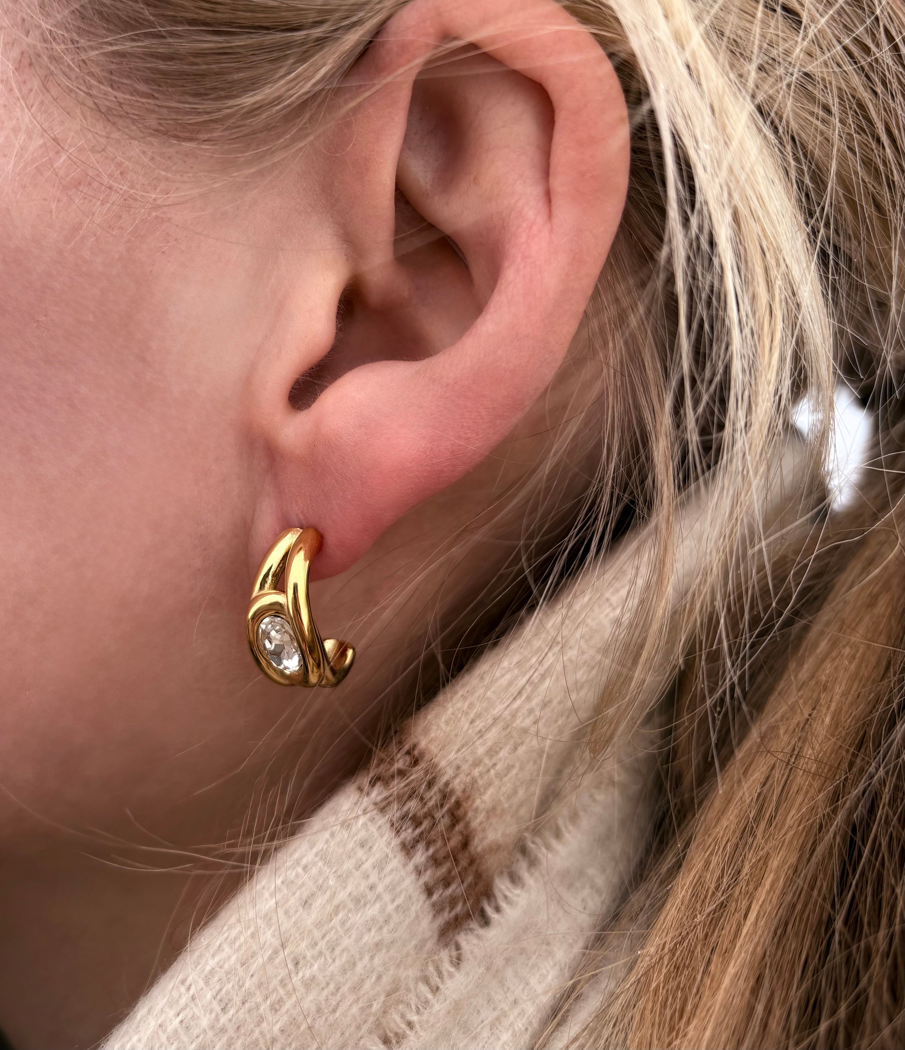 Diese eleganten Hoops zelebrieren das moderne italienische Design durch ihre dynamische, ineinander verschlungene Form. Ein zentraler, oval geschliffener Kristall wird von sanft geschwungenen, goldglänzenden Linien umschlossen und fängt das Licht bei jeder Bewegung ein.