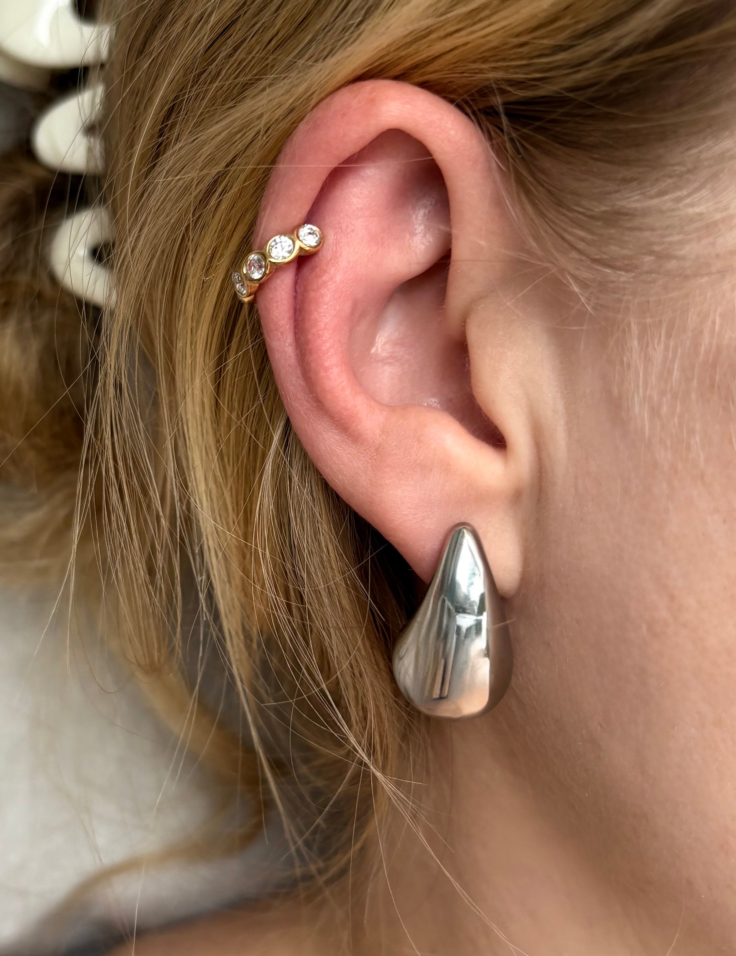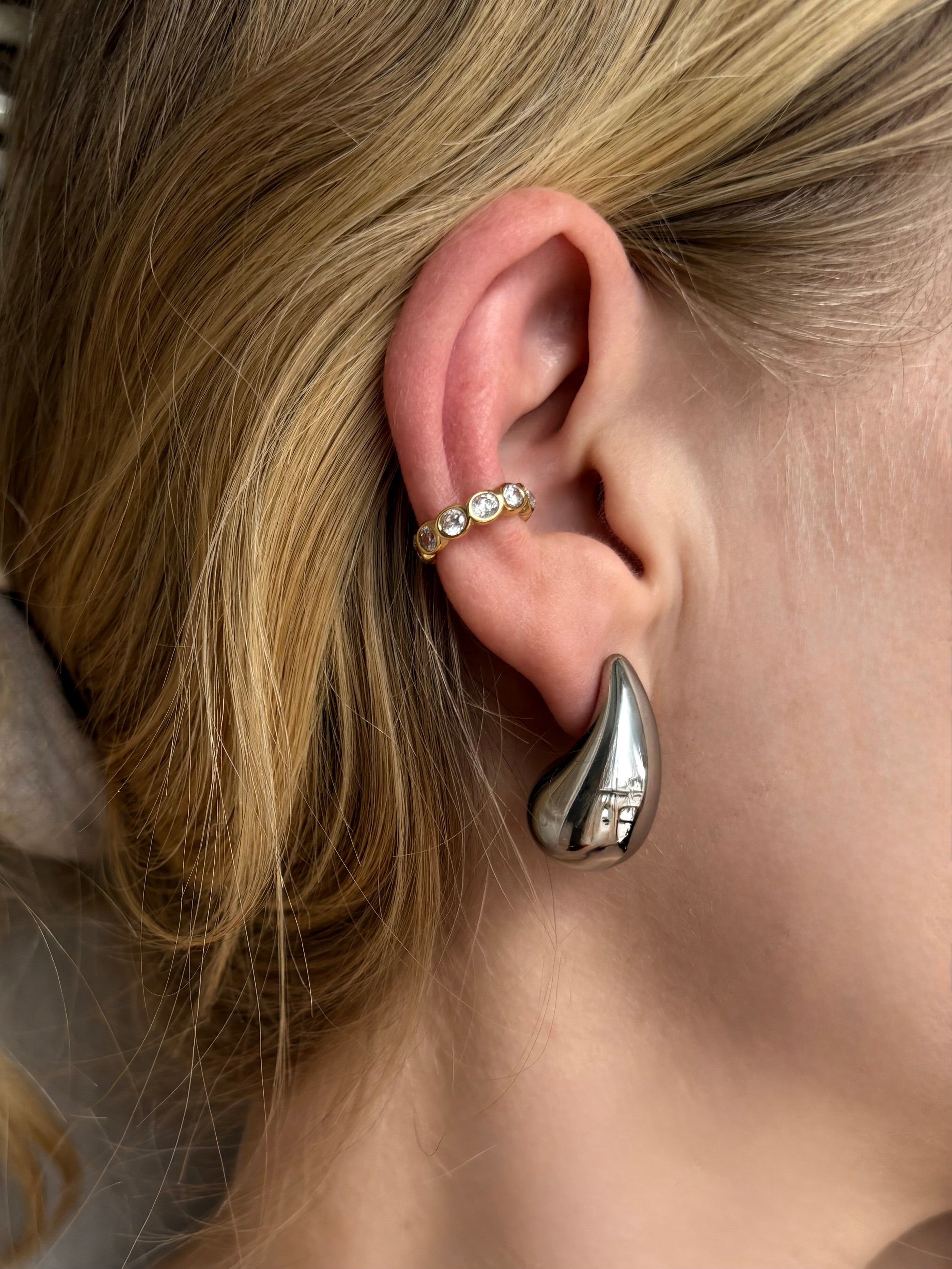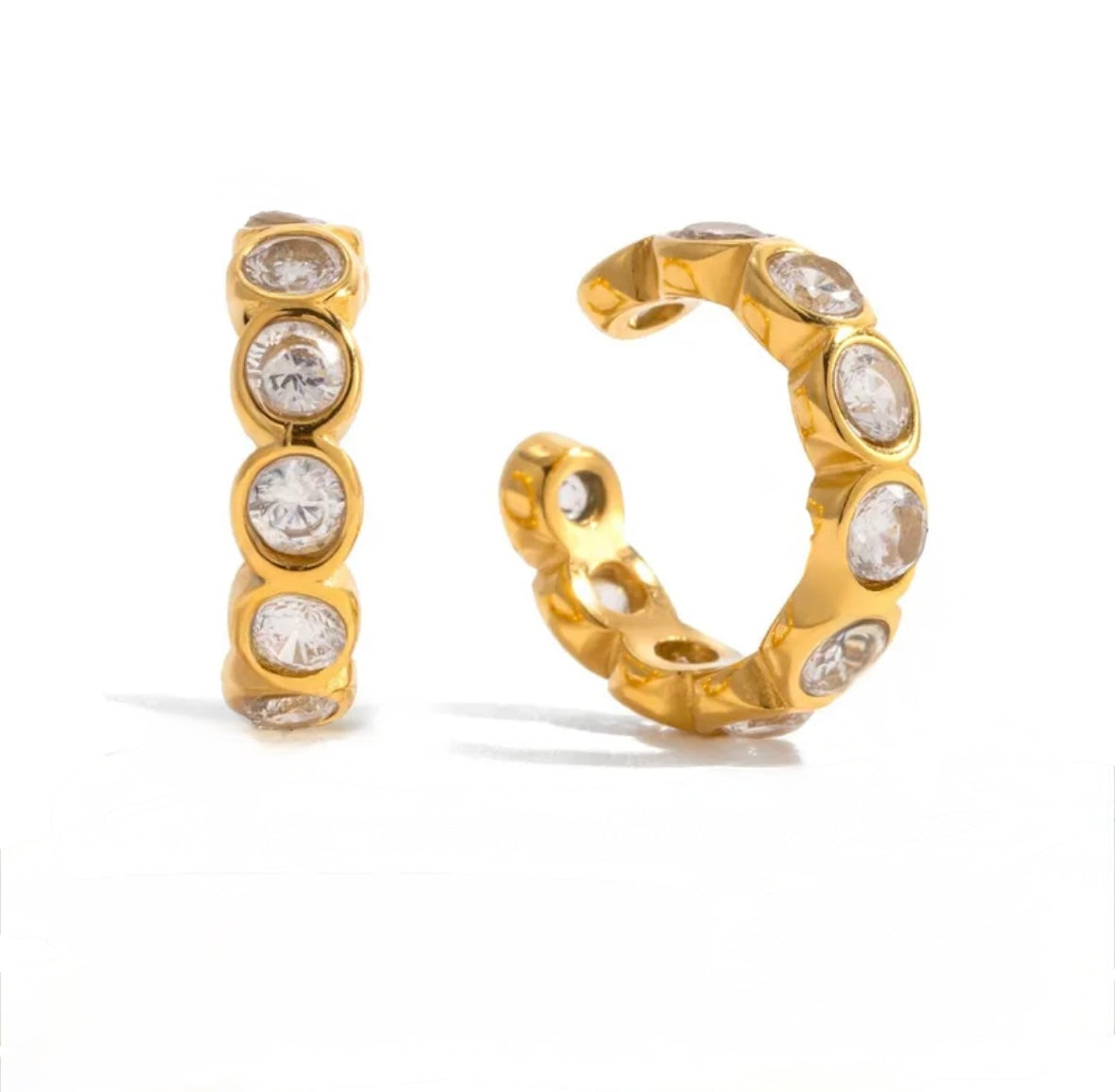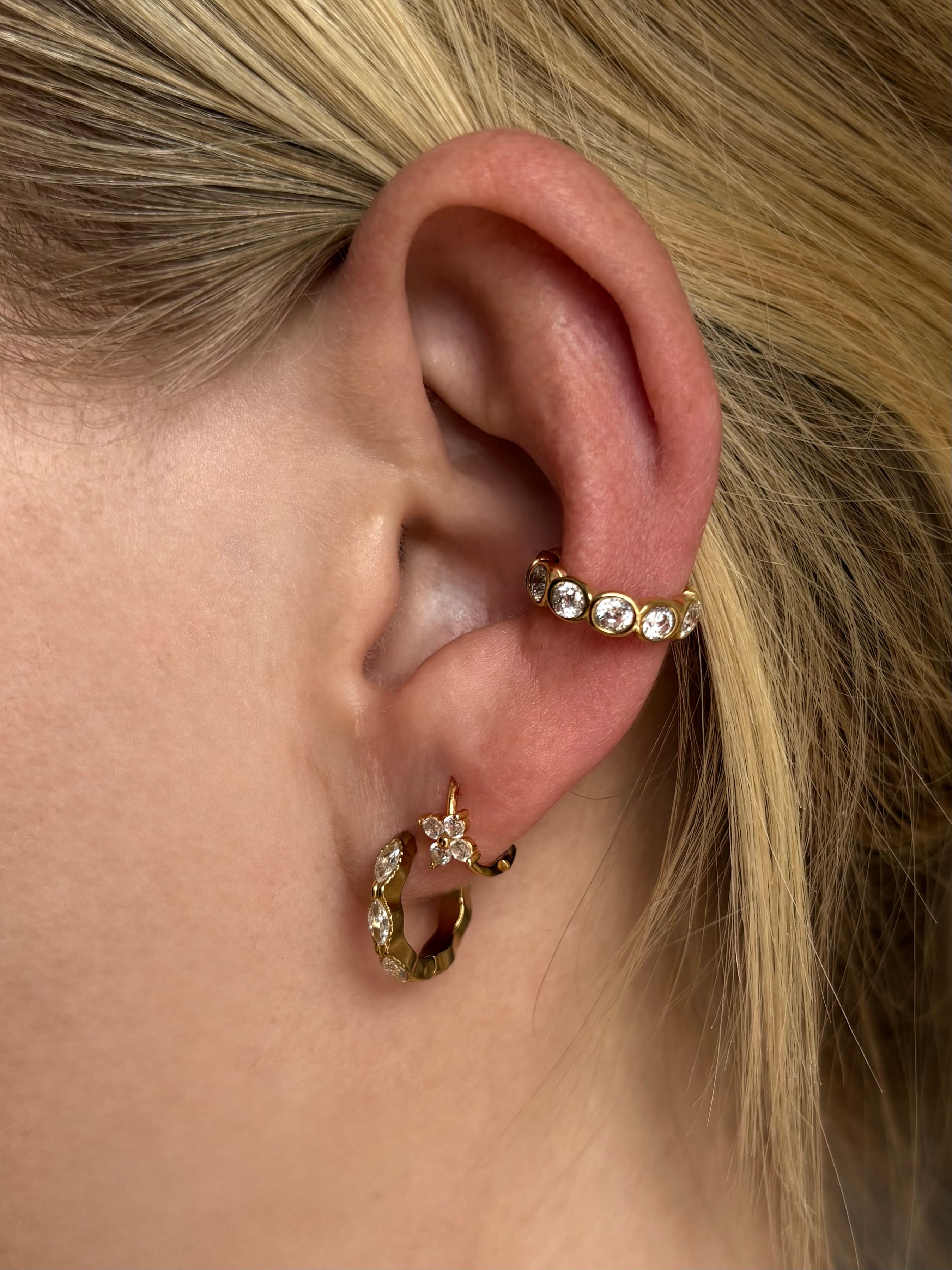 Dieser exklusive Earcuff verkörpert italienische Lebensfreude und zeitlose Eleganz. Gefertigt aus hochwertigem, goldglänzendem Finish und besetzt mit funkelnden Kristallen in Zargenfassung, schmiegt er sich sanft an die Ohrmuschel – ganz ohne Piercing.