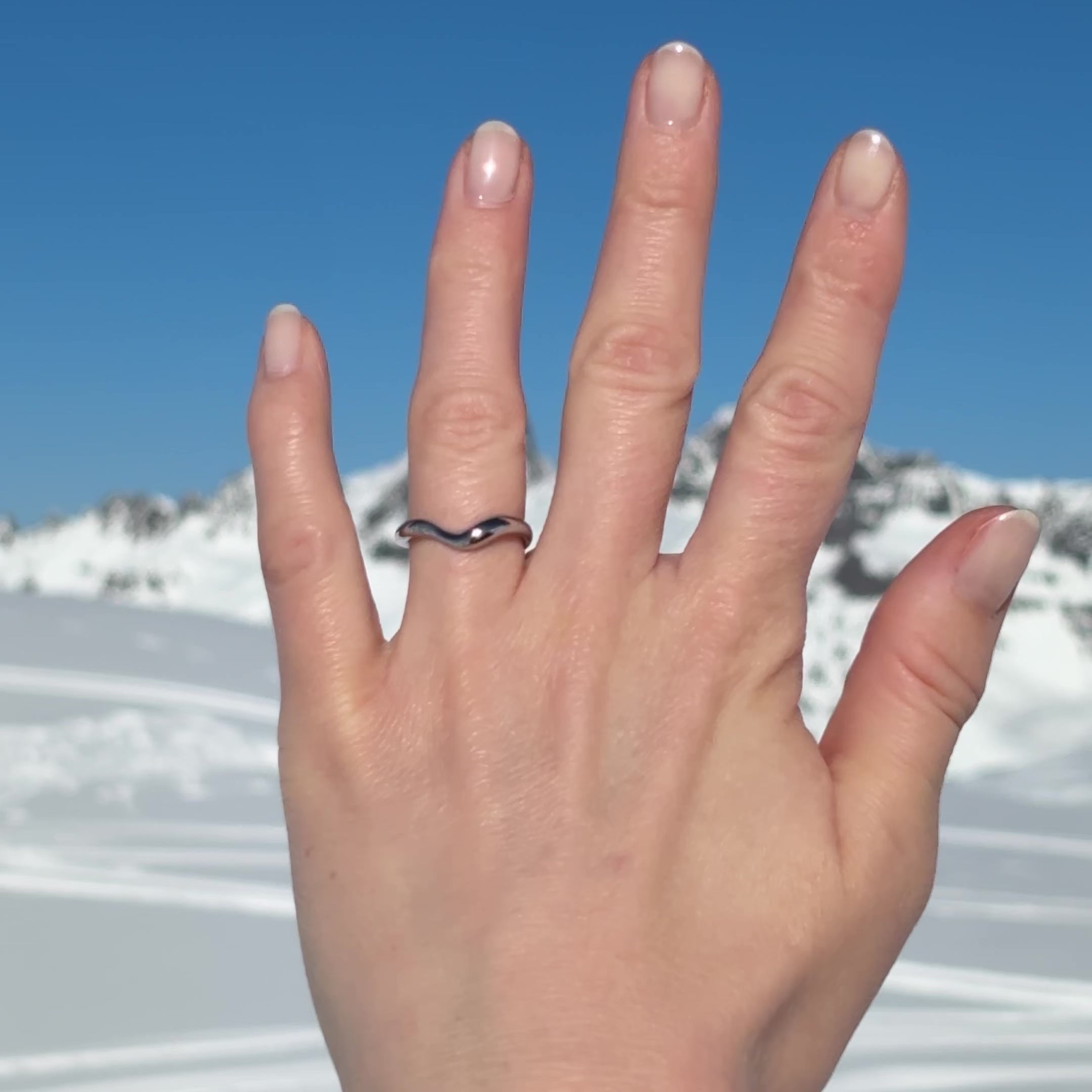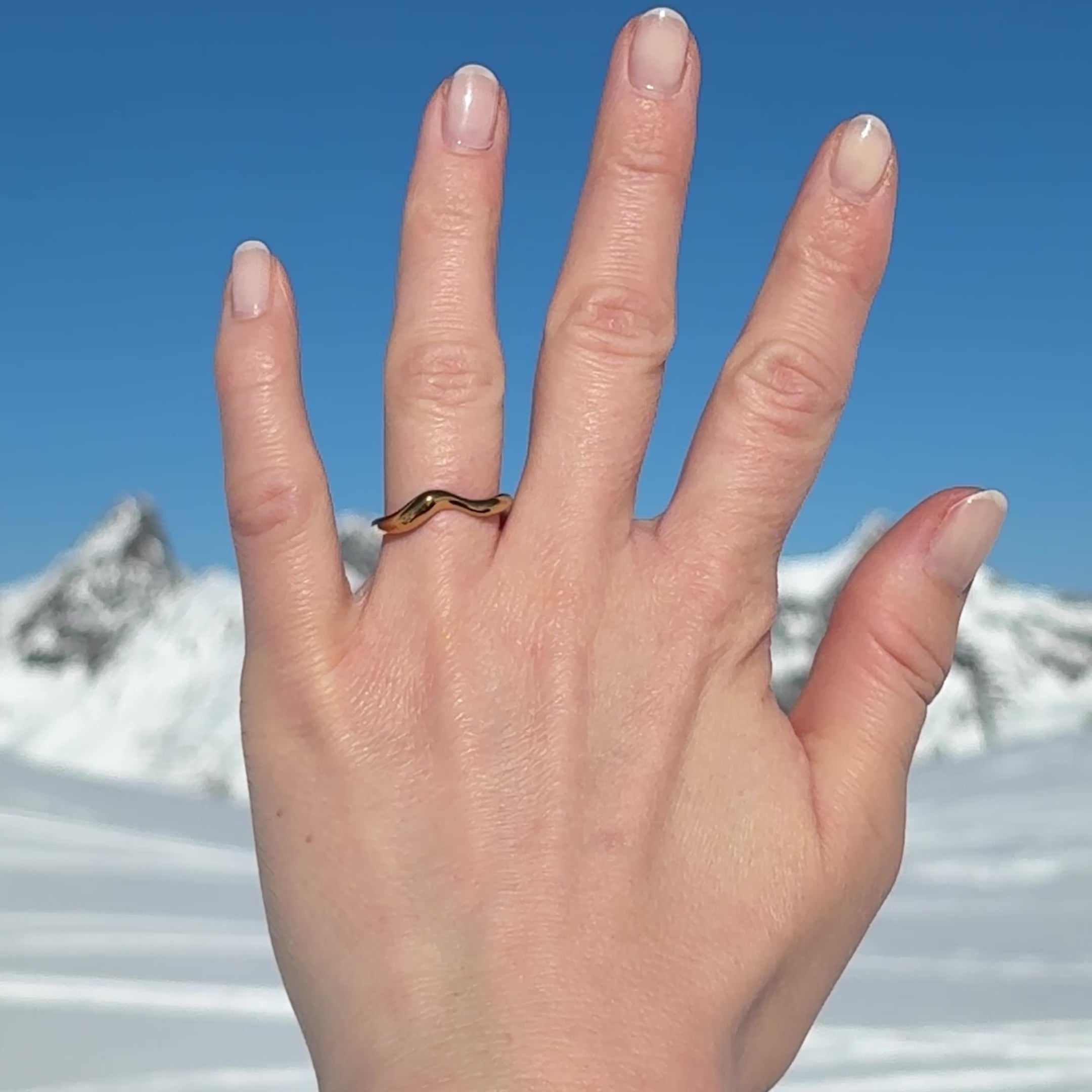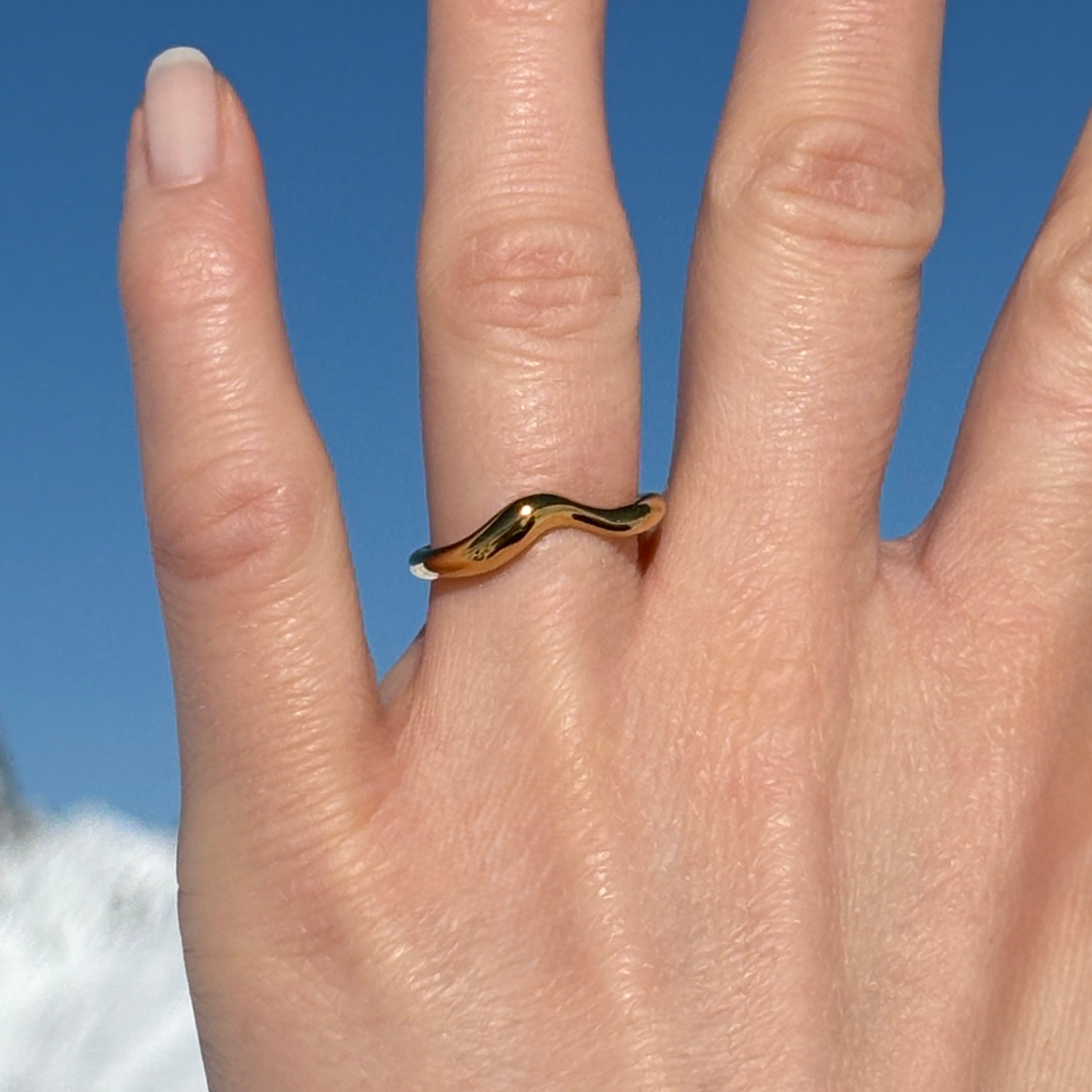 Das offene Design verleiht dem Ring eine subtile Leichtigkeit, während die hochglanzpolierte Oberfläche das Licht elegant reflektiert. Jede Rundung wirkt bewusst gestaltet und dennoch mühelos – wie eine Skulptur in Miniaturform.