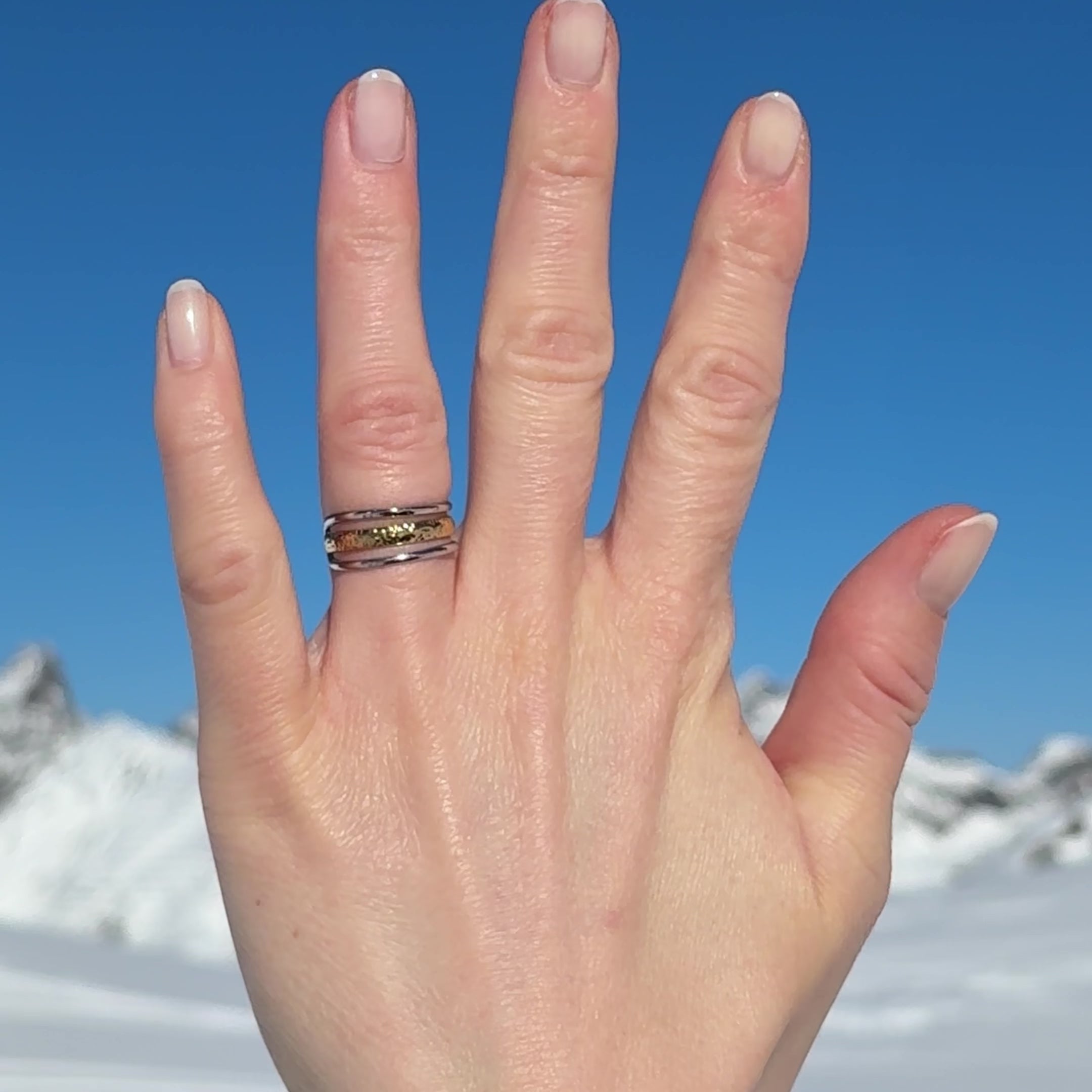 Der Anello Intreccio vereint klare Linien mit lebendiger Struktur. Zwei offene, silberfarbene Bögen umrahmen ein gehämmertes Goldband und schaffen ein spannendes Spiel aus Glanz, Textur und Kontrast.