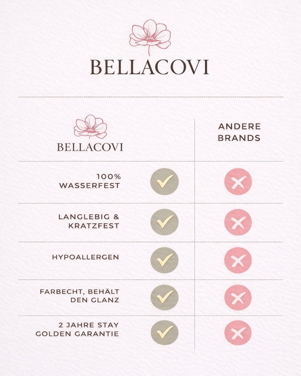 Dein Bellacovi-Schmuck ist zu 100 % wasserfest und darauf ausgelegt, dich überallhin zu begleiten. Ob beim Sport, unter der Dusche oder bei deinem nächsten Strandabenteuer – du musst ihn nie ablegen. Er behält seinen Glanz und läuft garantiert nicht an.