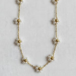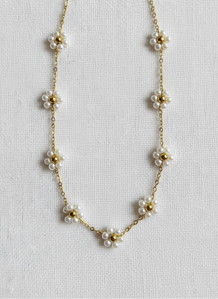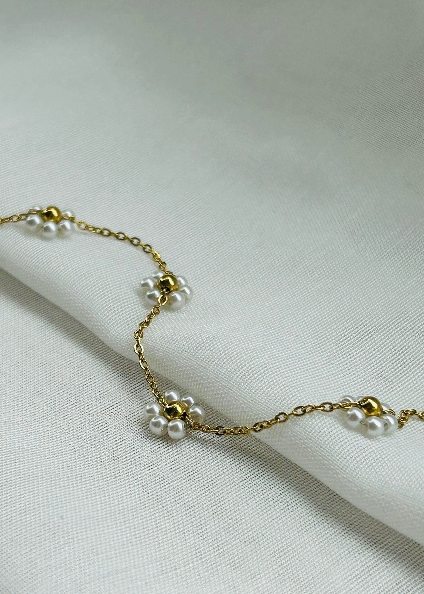 Filigrane Goldkette mit Perlenblüten. Feminine Leichtigkeit im Vintage-Stil.