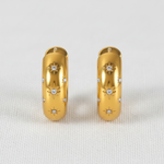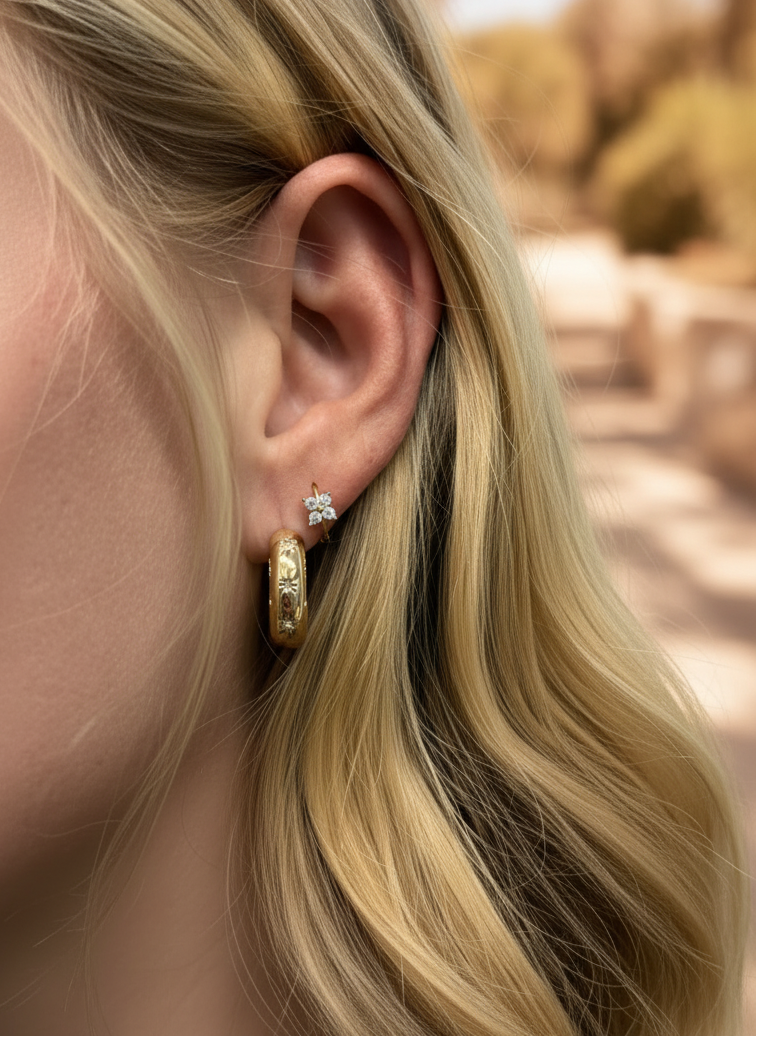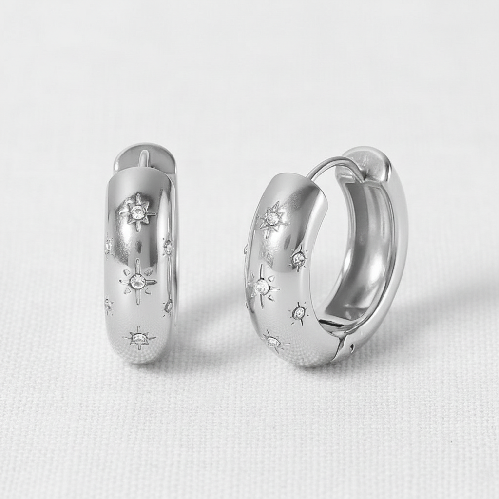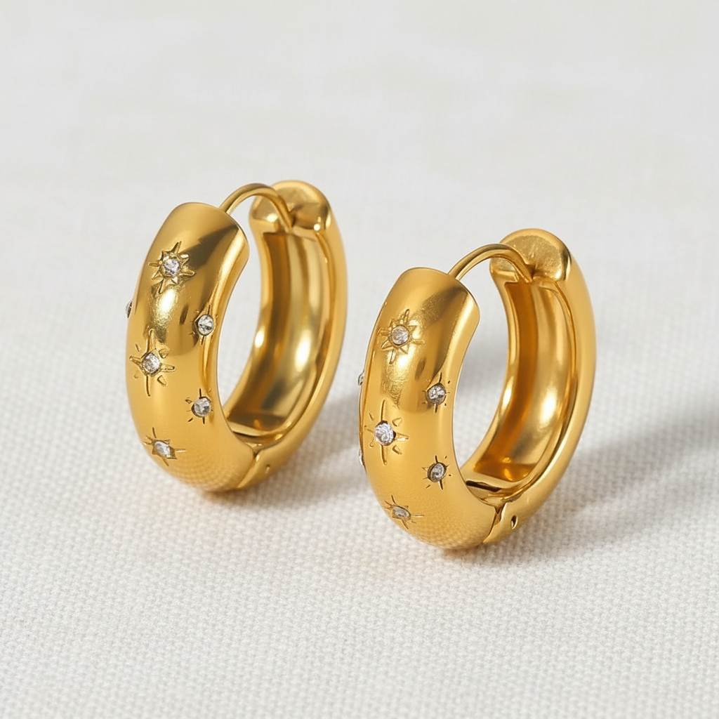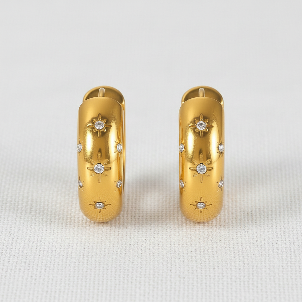 Creolen mit sanft gewölbter, großzügiger Silhouette und funkelnden, sternförmig gefassten Steinen, die deinem Look sofort einen dezenten Glow schenken. Elegant genug für den Abend, lässig genug für jeden Tag.
